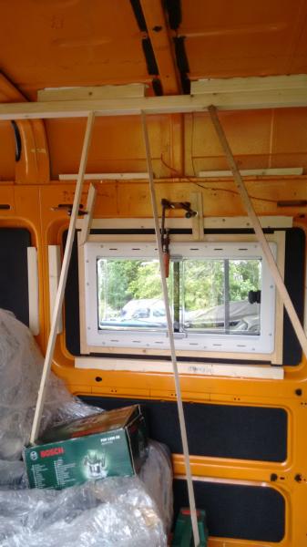 Nach die APK (TÜV) ohne Bemerkungen, dann weiter mit die Schritte um das Dach fertig zu machen. Erstmals Holz 44x44 gekauft und auf Maß gemacht. Um nicht zuviel Innenraum zu verlieren, sind die Verstärkungen für die Wandverkleidung und Möbel in in die versenkten Raumen verklebt mit Polymer-Leim ähnlich zu Sikaflex oder Bison.