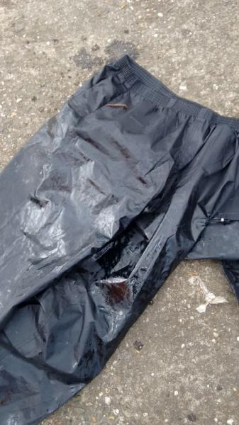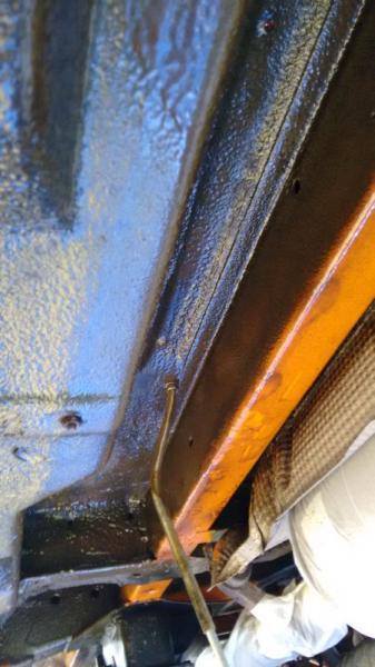 Schmutzige Arbeit... Regen- oder Einwegkleidung macht sicher Sinn! So lauft das überflussige Fluid Film A wieder aus die Holme... Ich muß jetzt noch das dickere Fett (ich habe Fluid Film AR) in die Hohlraume machen, aber erstmals muß der Fluid FIlm A einziehen und kriechen