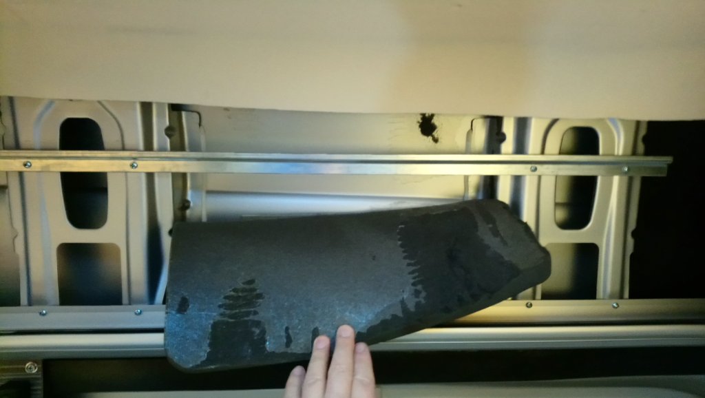 Nachher muss der zweigeteilte Zwischenboden links und rechts je ca 40mm abgesägt werden und auch vorn die vorgeformte Schräge mit den zwei Laschen für die Befestigung. Die braucht man nicht mehr. Dann liegt er saugend auf der wieder eingebauten Traverse auf und passt ringsum akkurat bis an die Isolierung. Irgendwann in den nächsten Tagen filze ich das alles mit Karosseriefilz und dann kondensiert da nichts mehr und sieht auch noch gut aus