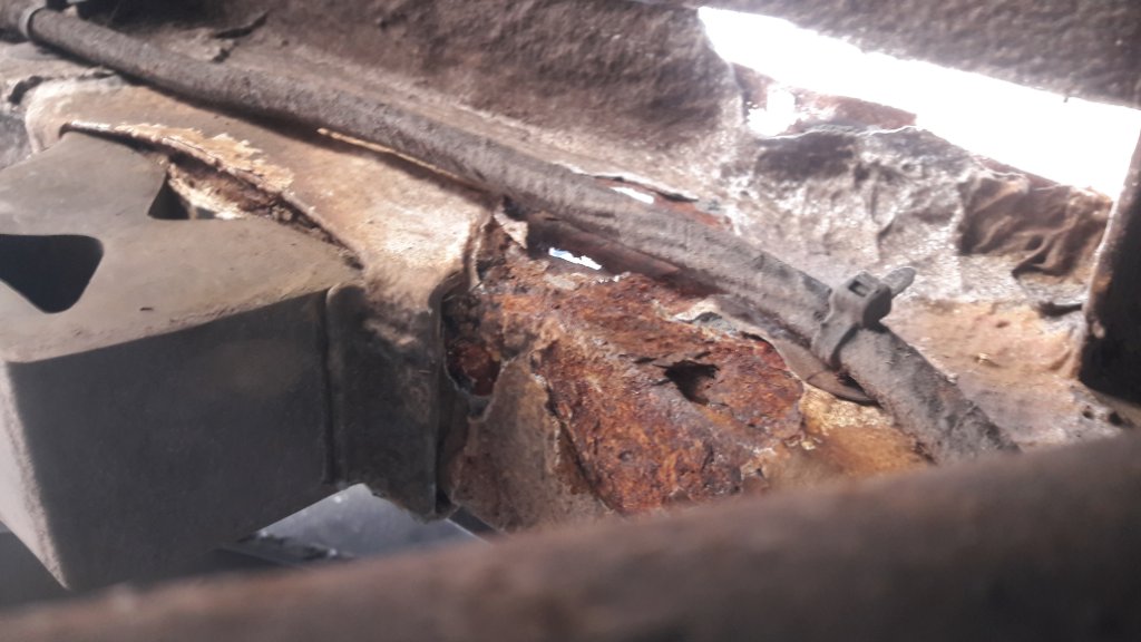 Leider kam dann hinter dem Unterbodenschutz eine fette Rostbeule im Längsträger zum vorschein. (Ich gehe schwer von aus, dass es sich bei dem Teil um den Längsträger handelt.) Ein bisschen den losen Rost abgekratzt und schon war ein hässliches Loch freigelegt.