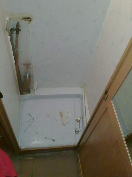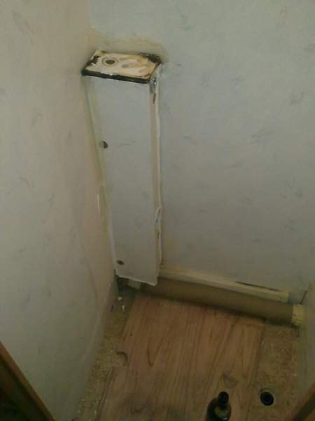 Hinter der Duschtasse lag das unisolierte Heizungsrohr. Aha, deshalb hat sich das dünne ABS der Dusche verformt. Is klar, ohne Hitzeschutz.