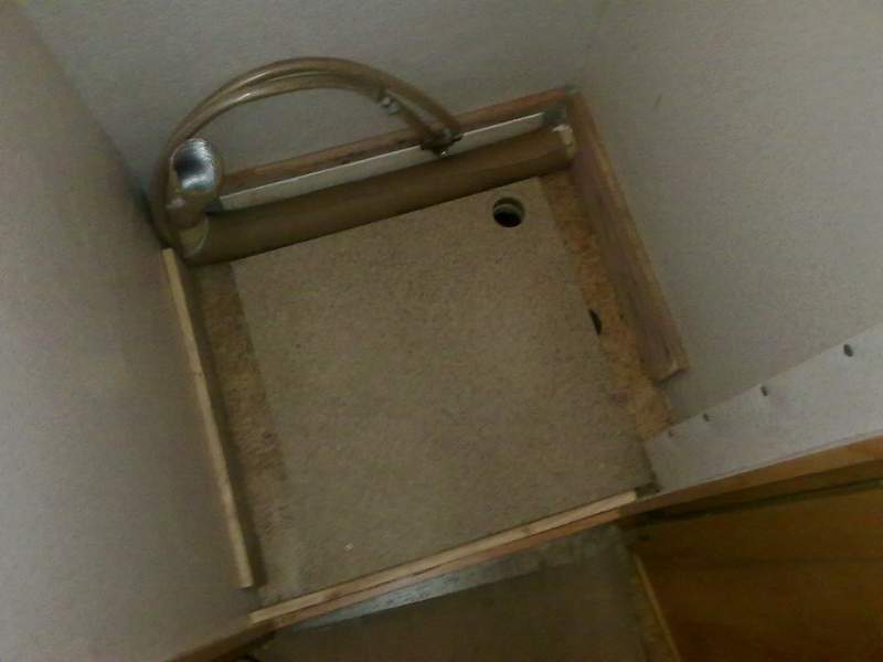 Dann wurde die Dusche wieder eingepasst und mit dem PU Kleber an Rand und Boden eingeklebt, der Wasserablauf nebst neuer Verrohrung im Doppelboden wurde auch angeschlossen.