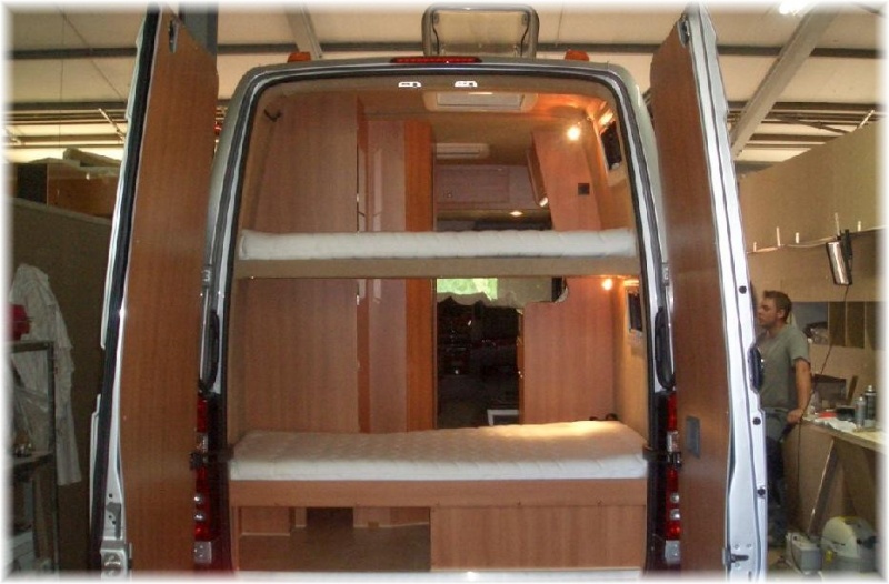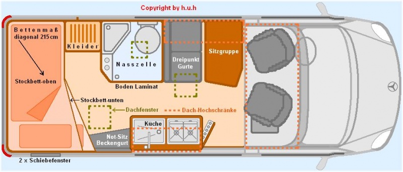 Hier noch meine platzsparende Variante mit viel Raumgefühl, Heckbetten übereinander diagonal auslaufend verbreitert, somit wird die Liegefläche bei leichter Querlage breiter, reicht je nach Größe der "Bewohner" aus !