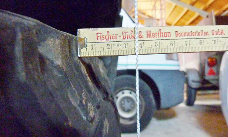 Ich habe nun mit Senklot am Kotflügel und Meterstab nachgemessen: es sind noch 35mm "Luft" (siehe Foto). Im Vorgriff auf einen beabsichtigten Besuch bei Goldschmitt habe ich dort heute die Daten/Fotos einmal vorgelegt; in einem Vorgespräch meinte der örtlicheTÜV-Ing. nämlich, dass die Kombination 245er Reifen und 30mm Spurplatten wohl kaum machbar wäre.