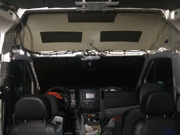 Der HD-Deckenmonitor hängt nun mit seinen nur 17,3" unter der Decke natürlich schon ganz schön hoch beim Hochdach-Sprinter, aber so läuft man wenigstens nicht mit dem Kopf dagegen, wenn man nach hinten durchsteigt. Funktioniert alles auf Anhieb, die zwei DVB-T Antennen kommen hinter die A-Säulenverkleidungen.