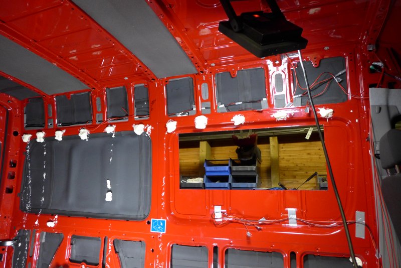 Arbeitsplatz Mühsames Verlegen des Kabelbaumes zur Hecktür in die Dämmebene Dämmen mit selbstkebendem Armaflex 25 mm und Ausschäumen des Horizontalholmes