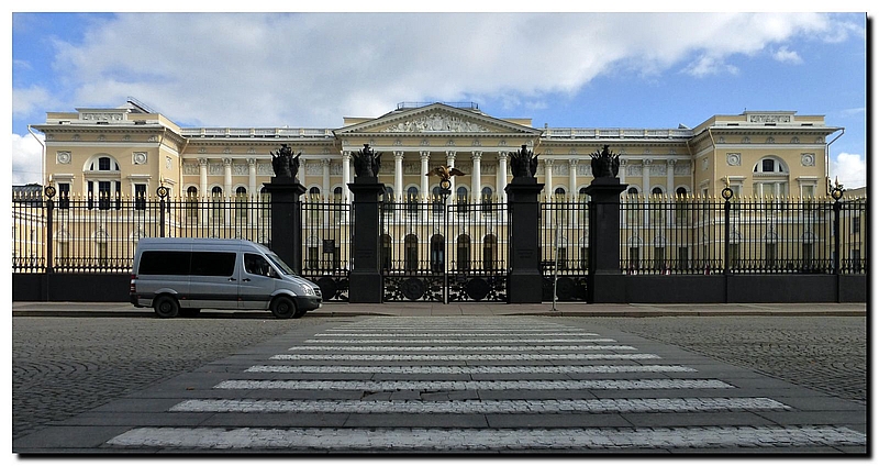 Am Winterpalast, heute Erimitage, vorne auch ein Sprinter als Marschrutka am Michailowski-Palast, heute Russisches Museum Torbogen an einem Nebenpalast in Petrodvorets bei der Palastanlage Petergof (Peterhof)
