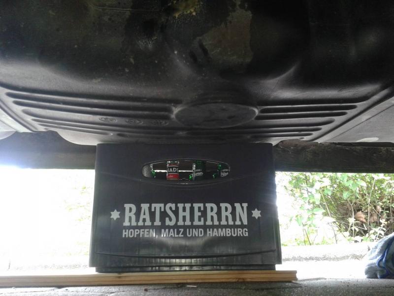 - Schrauben am Einfüllstutzen gelöst, dann Tank abgelassen und dabei gekippt, indem ich eine Bierkiste+Brett einseitig untergestellt habe. Fahrzeug stand dabei eben. Zuvor auch die Rücklaufleitung und Stecker des Tankgebers gelöst. So ließ sich die gesamte Gebereinheit mit etwas Geschick gut entnehmen. Da der Tank leer war habe ich den Tank später zum Einbau sogar ganz ausgebaut. Der Einbau war auch ohne weitere Hilfsmittel recht einfach möglich.
