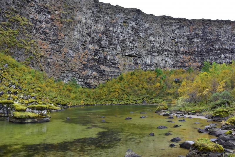 In Asbyrgi kann man einem Talkessel mit 100 m hohen Basaltwänden herumwandern. Auffällig ist die Vegetation in diesem Nationalpark. Es sind dort großflächig Birken vorhanden. Und auch die Bodenvegetation unterscheidet sich auffällig von den Flächen ausserhalb des Nationalparks. Ich hab jetzt nicht rausbekommen, ob die Birken etc. dort angepflanzt worden sind oder ob die schon immer da waren.