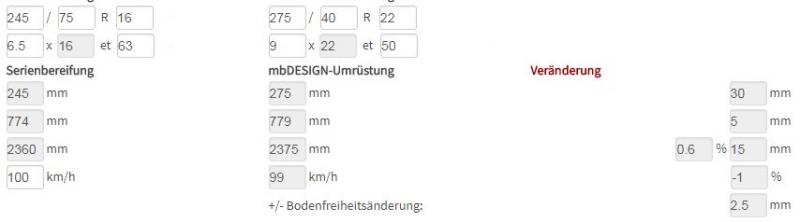 Derzeit fahre ich MICHELIN Latitude Sport 3 in 265/50R20 107/111, jedoch schleifen die vorderen bei vollem Lenkeinschlag. Der andere/nächste Sprinter bekommt aber die Lenkeinschlagbegrenzer. Die 285/35R22 auf 9" mit ET50 brauchen den Lenkeinschlagbegrenzer genau so, wie die 255/60R18 auf 8,5"x18 Et50.