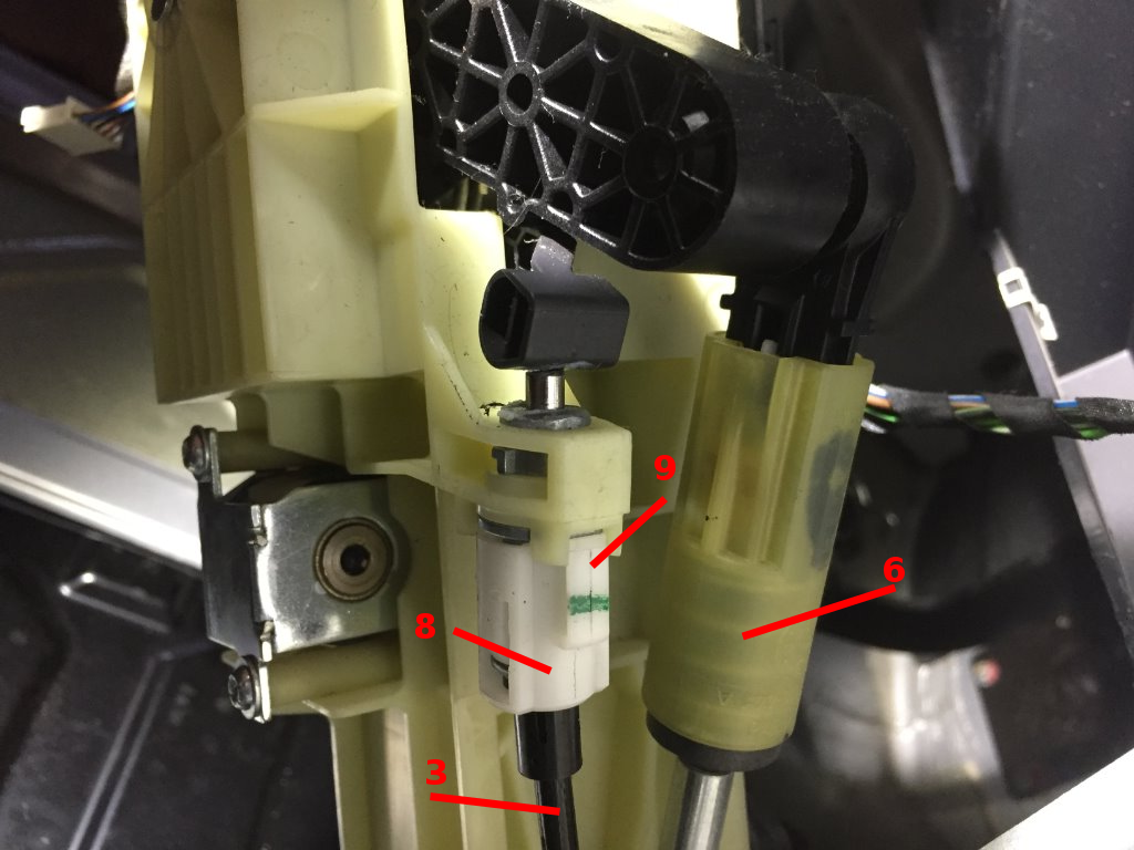 - An der weißen Befestigung des dünnen Bowdenzugs der Parksperrenverriegelung eine Lasche (9) anheben um die Hülse (8) um 90° nach links verdrehen zu können