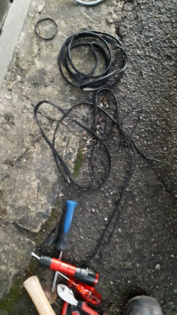 Dies ist das was von meinem alten Keilrippenriemen übrig geblieben ist :? Den hat es in lauter Streifen zerfleddert. Das schlimmste war dass es ein paar dünne Streifen um die Welle des Viskolüfters gewickelt hat. Da kommt man auch so toll hin! Das war ein Akt den Kram wieder wegzupopeln. Servopumpe lässt sich zum Glück leichtgängig drehen. Wird hoffentlich noch in Ordnung sein. Aber eine Umlenkrolle hat es auch zerrissen. Einer der Ringe ist liegt auf dem Foto oben. Vielleicht war dies sogar die Ursache für das Dilemma. Ich schau dass ich gleich beide Umlenkrollen wechsle, in der Hoffnung dass so etwas nicht so schnell noch einmal passiert.