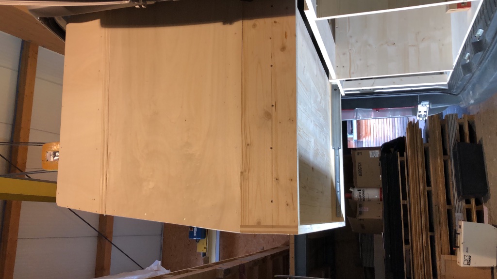 Die Kiste ist nun fertig. Hab die Box mit Alublech verkleidet, wetterfest. Unten, verdeckt und wettergeschützt vier Vollauszüge montiert. Anschlag und Dichtung am Fahrzeug mit gefalzten Leisten. Mit dem aufgeklebten Stoff richtig dicht geworden. Unten an dem Schiebebeschlag kommen noch Bürstendichtugnen rein. Das Bett ist nun 1,40mbreit und 2,00m lang. Das ganze ist aber nur ein Platzverlust von 1,10m im Fahrzeug.