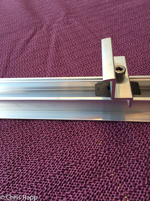 ...Solarpanels lassen sich dann mit den passenden K2 Systems XS Moduklemmen sehr einfach montieren. Das Schöne, es können Module mit verschiedenen Größen durch die Art der Montage montiert werden. Um ein verschieben der Panels zu verhindern habe ich kurze Aluwinkel an ihre Unterseite geschraubt, diese passen genau in die Schienen...