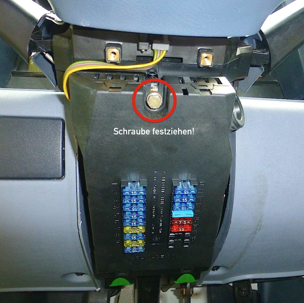 Bei einer Suche im Forum fand ich zunächst nichts relevantes und wollte dann die ZE ausbauen. Dabei zeigte sich schnell der Fehler: Die ZE war nicht richtig auf dem Kontaktblock aufgesteckt, d.h. die Schraube oben war nicht vollständig eingedreht. Daher waren viele Kontakte nicht korrekt mit dem Lenkstockschalter verbunden.