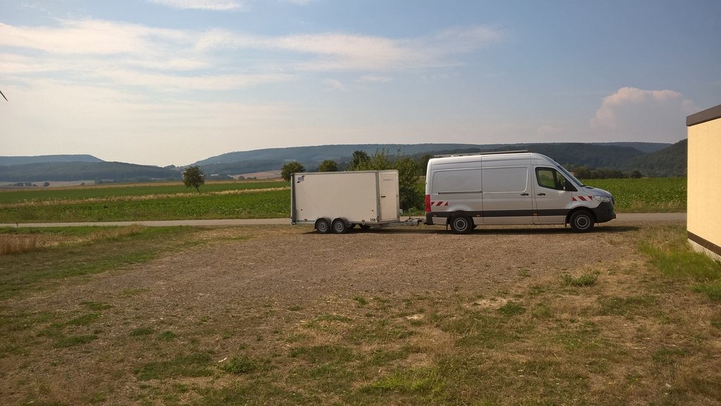 Sodele, mal von meiner Kutsche ein paar Fotos bzw. womit ich gerade so durch die Lande cruise. Der Sprinter hat gerade ganz gut zu tun die verschiedenen Hänger durchs hügelige Gelände bis hin zu Feldwegen zu ziehen. Wen es interessiert: Bin selbstständig, arbeite für eine Firma die Glasfaser verlegt. Die beiden Hänger ziehe ich für meinen Auftraggeber.