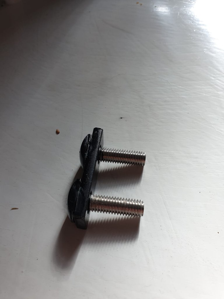 -Dazu habe ich entsprechend der Zeichnung mir zwei Stücke zugeschnitten und gebohrt. Der Durchmesser der Bohrungen ist ca. 1 mm WENIGER als das Diagonalmaß des Vierkantes der Schlossschraube. Anschließend habe ich die Schraube mit einer Mutter "gefühlvoll" reingezogen, sodass diese ebenfalls verdrehsicher ist: