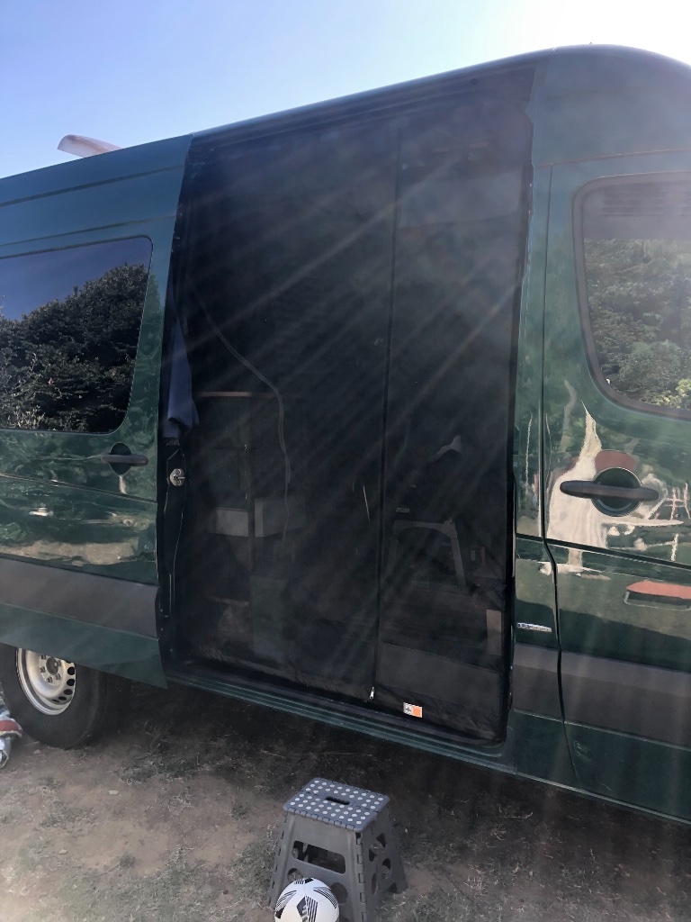 Dann noch ein Paar nützliche Gadgets: Vanquito Netz mit Magneten für Heck- und Schiebetür. Ventilatoren für die Dachluke. Und Aufsteller für Schiebetür und Heck zum Abschließen.