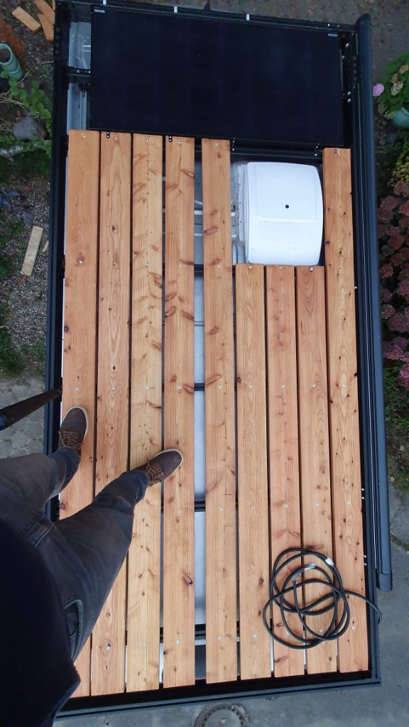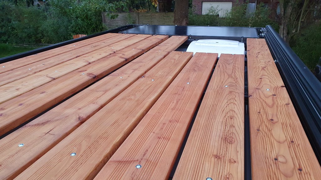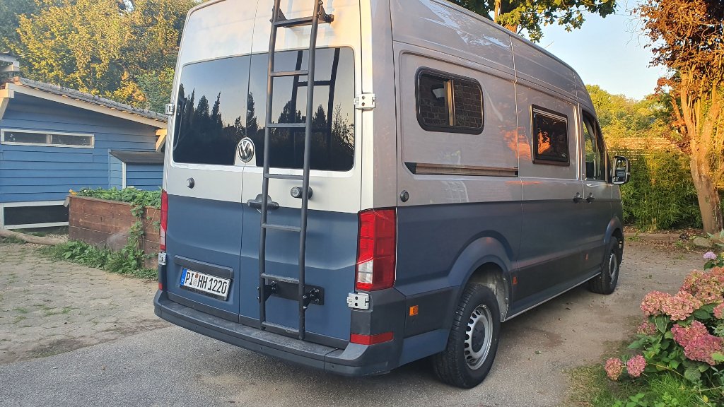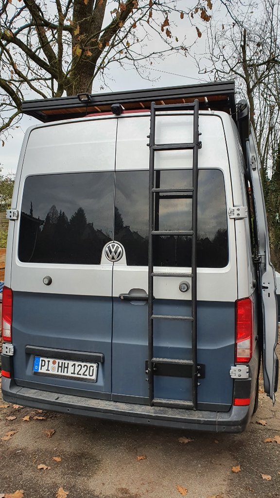 Dazu noch eine Heckleiter hinten ran, dafür die Tür von innen noch mit einem Holzrahmen verstärkt. Das Blech der Hecktür hat beim Besteigen der Leiter doch zu sehr geflext. Schönen Gruß