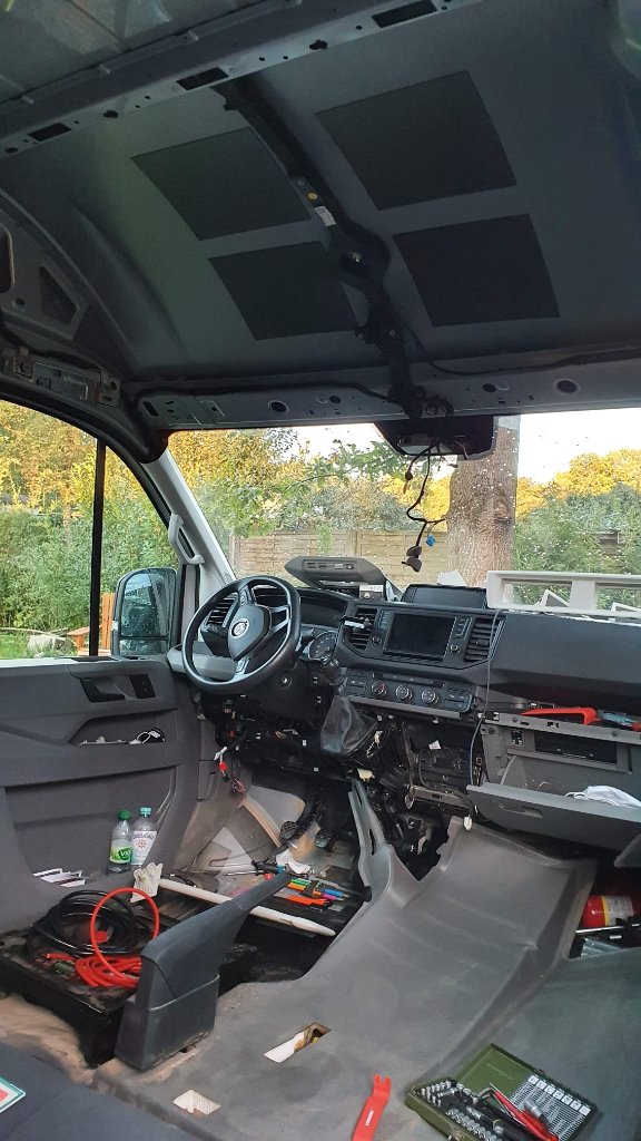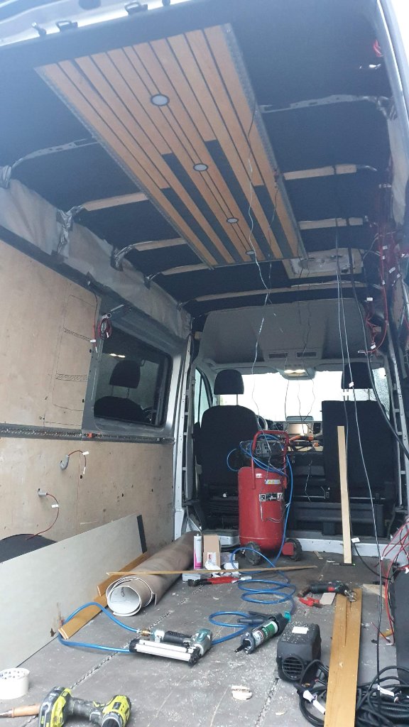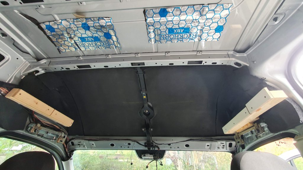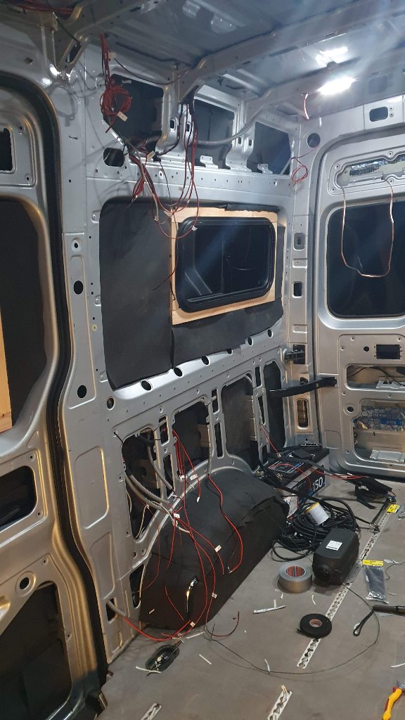 Alle Kabel rein, z.T. mit Kabelkanälen bzw. Leer-Rohren. Bei knappen Durchgängen auch mal ohne. Die Karosserie des Crafter hat schon im leeren Zustand ganz ordentlich mit geklappert. Die weiten Spaltmaße die der Kleber z.T. zwischen Außenblech und Steifen überwinden muss, ist ja im Crafte/TGE anscheinend ein Thema. Um die Geräusche zu reduzieren und gleichzeitig die Dämmung noch weiter zu verbessern habe ich da wo es möglich war klassisches Klemmfilz im wahrsten Sinne des Wortes "geklemmt". Damit können die Bleche nicht mehr so stark schwingen, da sie sich nun auch über die Dämmung an der inneren Holzverkleidung abstützen können. Um später keinen Schimmel durch Kondensatbildung zu bekommen wie im Hausbau mit Dampfbremse abgedichtet, bevor dann eine Holzverkleidung darüber kam.