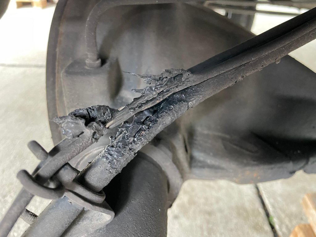 Die heißen Abgase haben die ABS- und Bremsleitungen dahinter / auf der Achse verschmort.