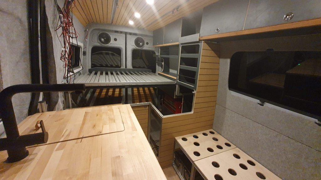 Nachdem die Oberschränke für die Fahrerseite montiert waren, hab ich also den Mittelblock begonnen. Der Hintergrund für den etwas zerklüfteten Grundriß ist der Umstand, dass auf der Fahrerseite die beiden MTB auf der Schublade stehen. Das ganze sehr eng und mit wenig Luft. Dadurch kann ich auf der Mitte der Fahrzeuglängsachse die Trennwand zur Garage noch etwas weiter nach hinten verschieben, so dass man auch ohne Klettereinlage besser an die hinteren Staufächer herankommt . Über die Hinterräder der MTB`s soll eine kleine Ablagefläche entstehen. Die war etwas herausfordernd, da diese ebenso wie das Bett höhenverstellbar sein muss, um die Vorteile des höhenverstellbaren Bettes ausnutzen zu können. Ich war mir nicht ganz sicher, dass das klapperfrei und trotzdem sicher und schnell zu verstellen bzw. zu fixieren geht. Einmal angefangen ging es aber dank der Aluprofile und entsprechender Drehgriffe/Nutensteine sehr einfach. Optisch muss es am Ende noch etwas aufgewertet und verkleidet werden. Erstmal funktioniert es aber. Die kleine Tür in der Trennwand zur Garage reicht noch gerade zum durchkrabbeln, und ist schon fleißig für den Transport von Surfboards, Baumaterial für den Garten etc. benutzt worden. Sehr froh, dass diese Möglichkeit besteht.