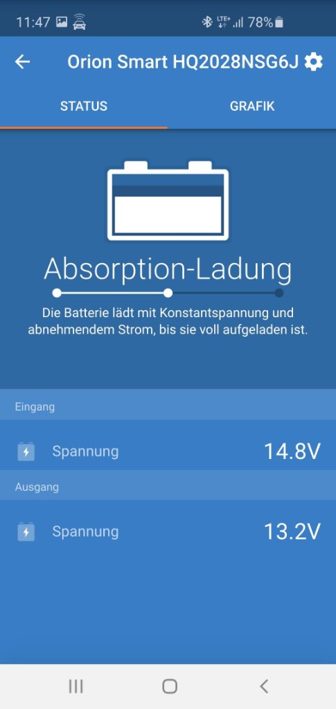 Außerdem ist die Bluetoothfunktion der einzelnen Komponenten schon eine feine Sache:-) Dadurch kann man fix übers Handy oder Tablet den E-Zustand überblicken, ohne aufwendige Monitor- und Bus-Systeme zu verbauen. Eine kleine Anzeige für den Messhunt, an dem auch zumindest die Spannungsüberwachung der Starterbatterie angeschlossen ist, habe ich mir dann doch noch gegönnt. Ich habe zur Info mal ein paar Screenshots der Victron App beigefügt, das ganze allerdings bei reichlich Bewölkung und natürlich flachem Sonnenstand.