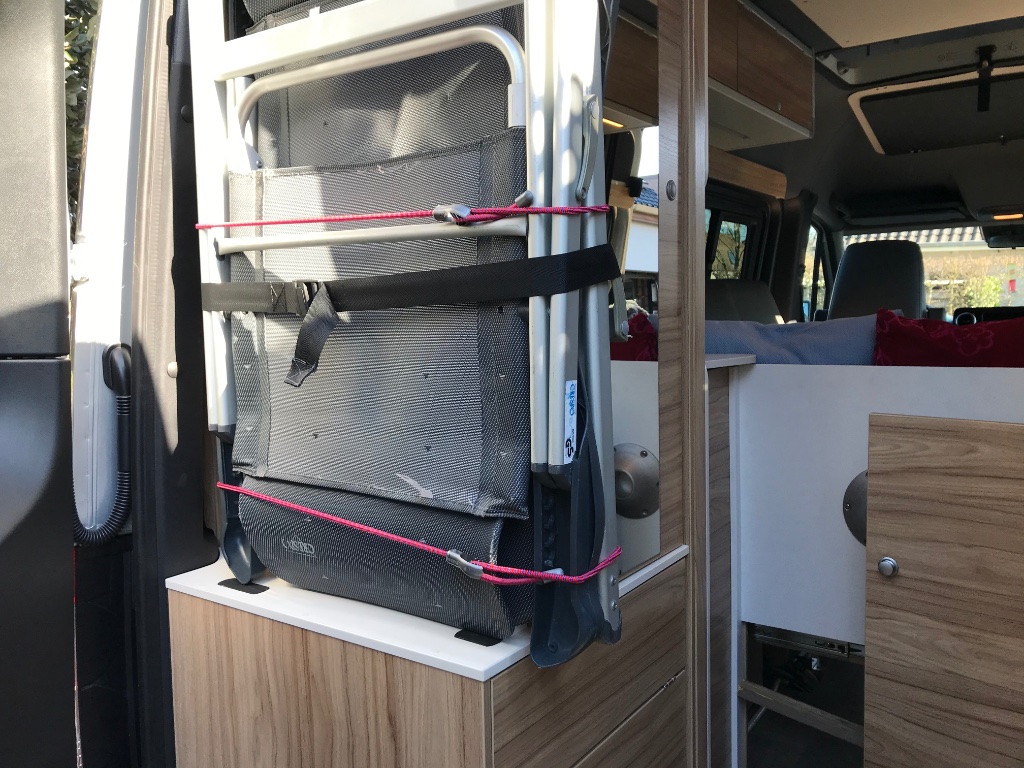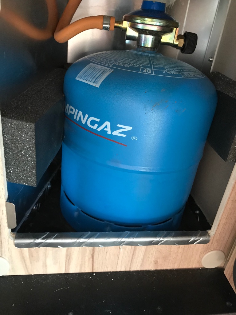 Die Flasche ist jetzt ringsum mit dickem Schaumstoff gespannt und der nederdruckregler wird von Campinggaz selbst hergestellt ... viel kompakter, sowie ein Brett über dem Gasschrank.