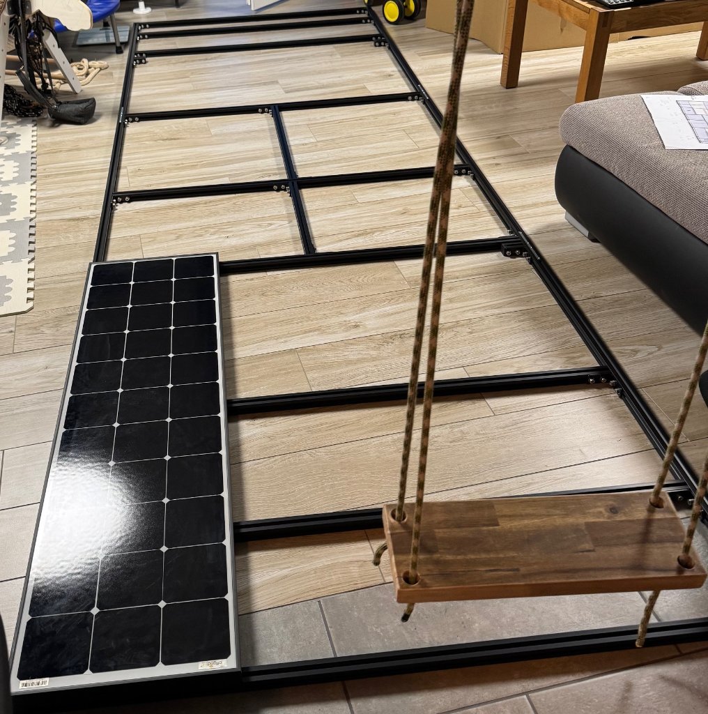 Nun habe ich ein Dachträger aus Aluprofilen gebaut und dort die Solarpanels als auch die Winkel mit Edelstahlschrauben A2 in verzinkten Nutensteine geschraubt und auch mit Loctite gesichert.
