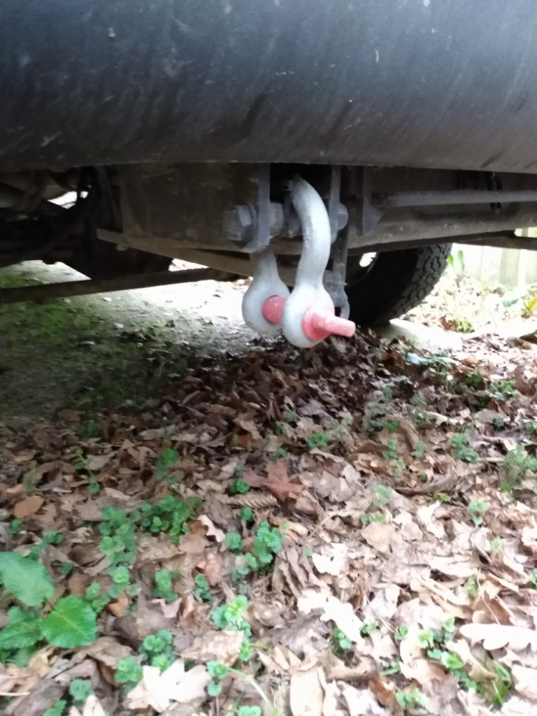 Beide Begeösen sind gleich aufgebaut und hinter der Stoßstange versteckt, die unter den Trittstufen aufgeschnitten wurden um sie dann nutzen zu können. Die Bohrung ist so groß, dass ein 3,75 to Schäkel rein passt.