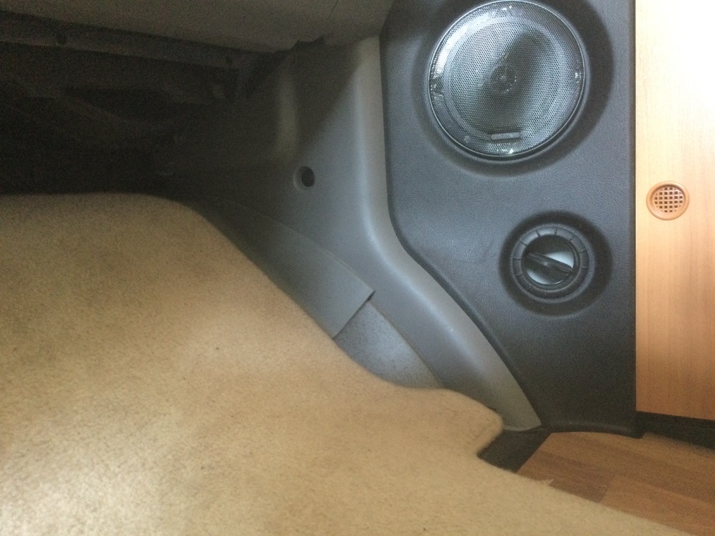 Die Lautsprecher können bleiben. Es müsste reichen, wenn du die graue Radhausverkleidung abnimmst. Eventuell muss noch die Klappe des Handschuhfachs raus. Das wirst du dann sehen. Dahinter muss der untere Teil des originalen A-Säulen-Restes stecken, auf dem der CAN-Bus-Verteiler montiert wurde.