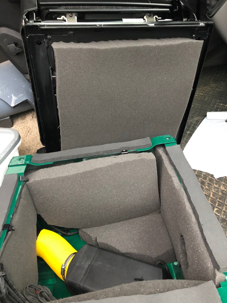 Außerdem hat die Standheizung im Sitzkasten eine Geräuschdämmung auf der Ansaugseite bekommen und unter dem Podest einen Schalldämpfer auf der Warmluftseite: