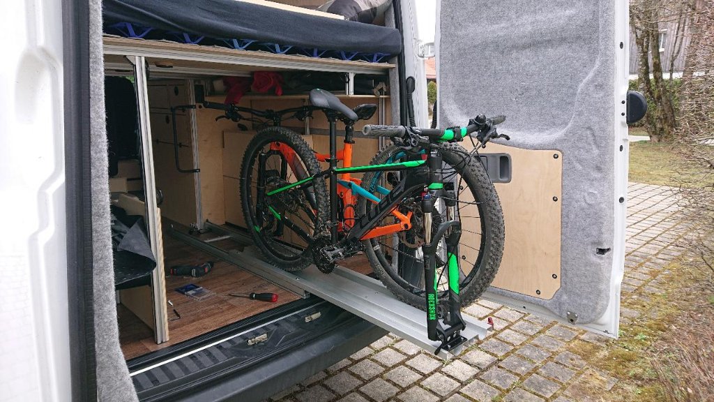 In der Garage kam dann der Fahrradauszug dazu. Wer sich denkt: da nehm ich was fertiges - lasst es sein. Ich hab das Teil von Fiamma da reingespaxt und Gabelhalterungen draufgeschraubt. War ne Scheißarbeit, hat auch funktioniert, aber das Ding ist einfach zu umständlich, hat zu wenig Auszuglänge und ne ordentliche Geräuschkulisse. Ich zeig also einmal, dass das Ziel umsetzbar war, mittlerweile siehts aber anders aus.
