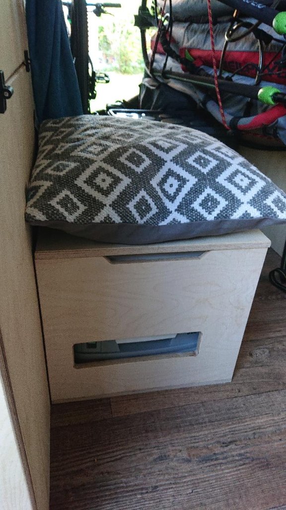 Außerdem hab ich dann noch eine lose herumlungernde Kiste für unser Porta Potti gebaut, hier kann im Zweifel noch eine Person an der Stirnseite vom Tisch Platz nehmen. Der Rekord mit Innen Tee trinken nach dem Langlaufen im Winter liegt bei 6 am Tisch sitzenden Personen, die Damen waren aber alle recht schmal
