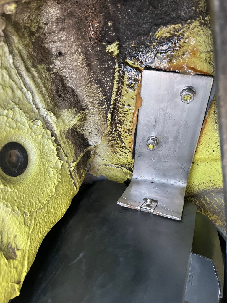 Verwendet habe ich für die Lappen auch wieder das 4 mm-Gummi, sowie einen großen V2A-Stahlwinkel (3 mm) der an den hinteren an der Karosserie verschweißten Schrauben befestigt ist. Das sind wohl die Schrauben, an denen der originale Lappen auch befestigt wird. Der Lappen selbst und auch der Lokari ist am Winkel mit einer Blechmutter befestigt. Zwischen dem großen Winkel und der Karosserie liegt ein entsprechend großer Gummi (2 mm). Befestigt wurde der Winkel, nachdem dort gesäubert und ordentlich FluidFilm drauf kam. Alle anderen Befestigungspunkte wurden gegen Korrosion geschützt (Brantho, Mike Sanders, FluidFilm). An den Stellen, wo Blechmuttern auf originalen (lackierten) Karosserieblech aufgeschoben wurden, sind die Blechmuttern mit einem dünnen Gummi ausgekleidet (alter Fahrradschlauch). Die Lokaris sind an keiner Stelle direkt im Blech verschraubt, sonder immer in Blechmuttern. Der große Winkel sieht so schön aus, da ich keine Abkantbank habe und den Winkel mit dem Schraubstock und Hammer geformt habe