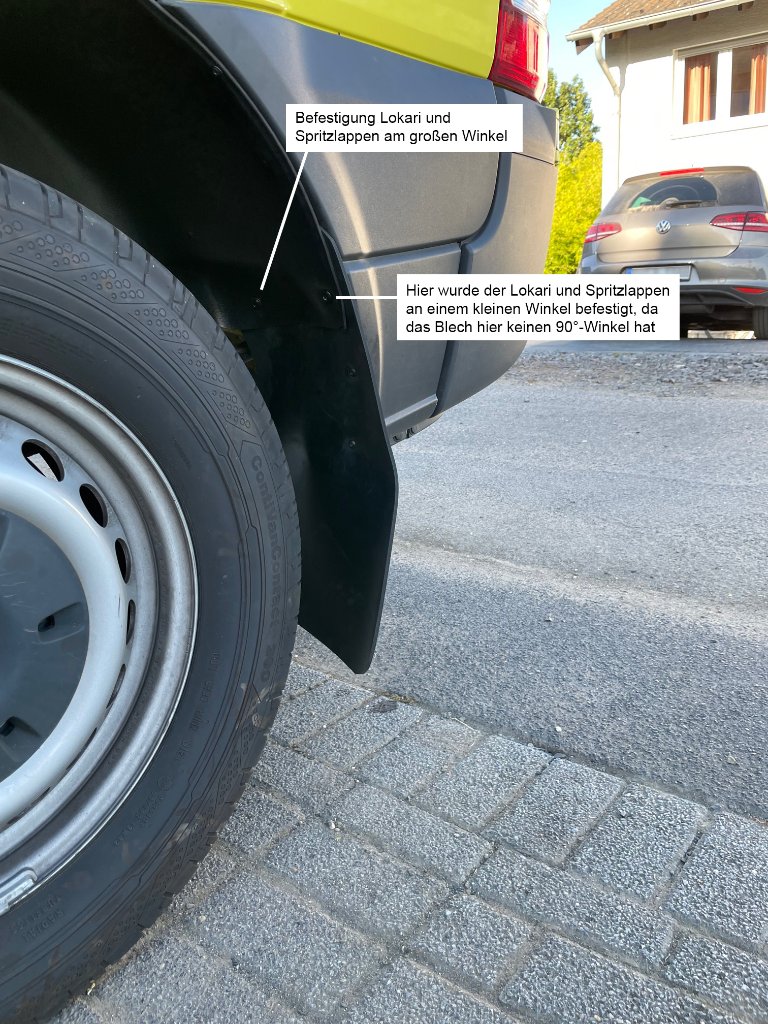 So, jetzt komme ich dazu, endlich mal die Bilder der hinteren Version einzustellen. Das hat alles ein wenig gedauert, da mich momentan die Arbeit im realem Leben sehr einspannt. Die hinteren Lappen habe ich bei der Montage der Lokaris mit eingebaut. Für die Lokaris habe ich auch einen kleinen V2A-Stahlwinkel (2 mm, analog vorne) verwenden müssen, da das Blech im hinteren Teil der hinteren Radkästen keinen 90°-Winkel aufweist. Unterschied zu den längeren Versionen des Sprinters.
