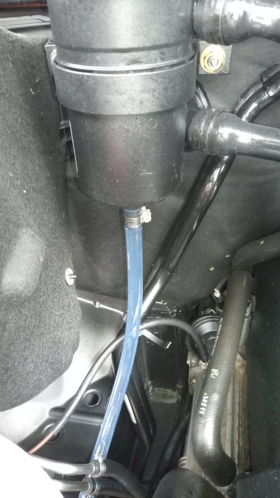 Hatte ich noch in der Garage rumliegen...vom Heizkörper....muss erstmal reichen bis ich eine passende Buddel finde. Hängt vorne zwischen vorderer Radhausschale und Träger raus und kann ggf. vom Radhaus her entleert werden.