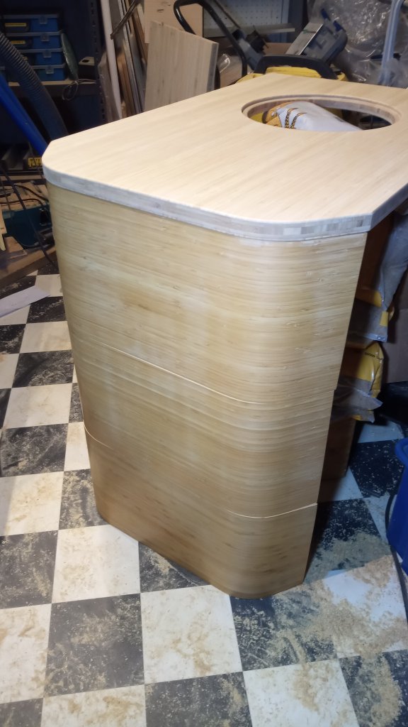 Bei mir war es heute wieder so weit. Ich habe der Arbeitsplatte die Kontur der stirnseitigen Schubfächer angefräst, geschliffen und nochmals geschliffen, um zu sehen, wie es dann später im Auto wirkt. Somit sind zwei Deckseiten des Schranks (vorn und oben) fertig vorbereitet.