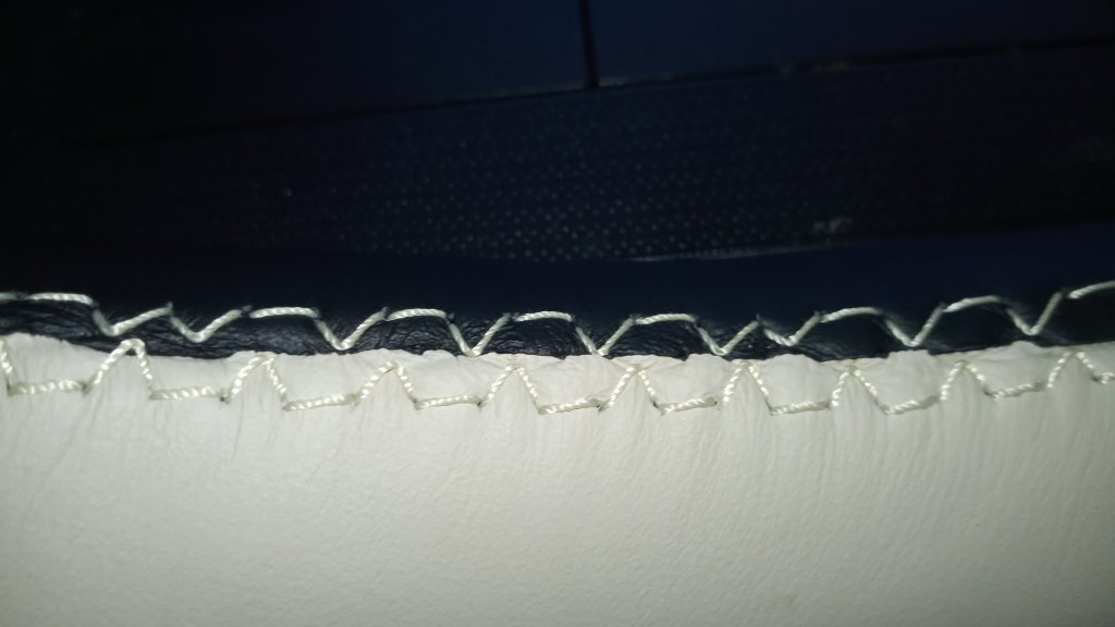 Überraschung Nr. 3: die softe Polsterzwischenlage zwischen Lenkrad und Lederbezug und der Kleber bremsen die Nadel dermaßen ab,