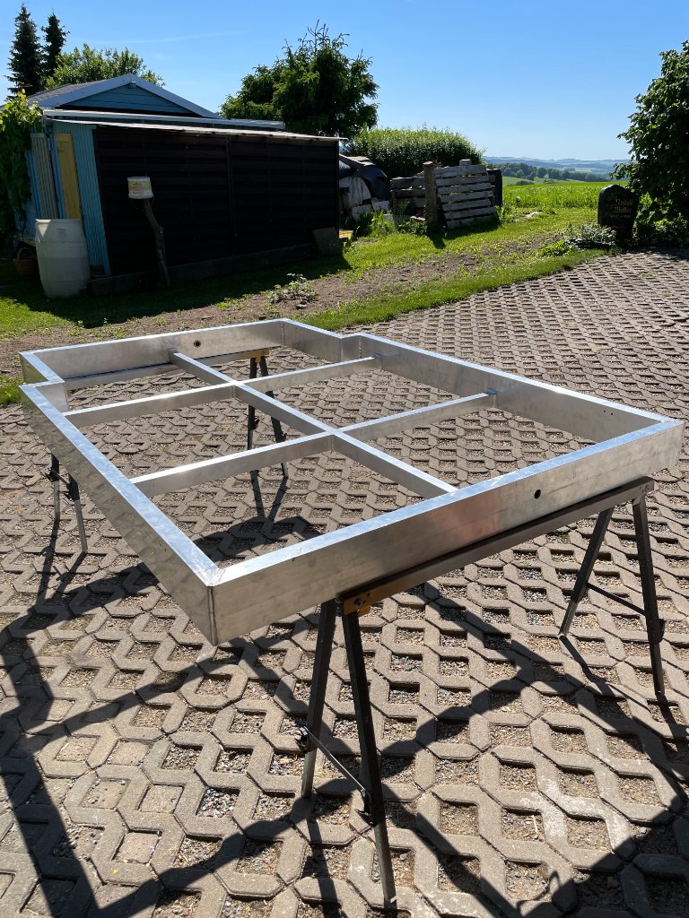 Geschweißter Alurahmen - Maße 2000x1400, ca. 25kg (am Ende 1200, um weiter nach oben zwischen der B-Säule zu kommen): Alurahmen mit altem Schneckgetriebe einer Markise, Stahlstange für die Gurtaufwicklung und Stehlager bei 1/3 und 2/3 Bettgestell im Sprinter befestigt. Der blaue Spanngurt war ein damaliges Provisorium Den Haken der Markisenkurbel wurde abgetrennt und passt mit 13mm in meinen Akkuschrauber. Auf dem Gestell selbst liegen zwei 4mm Pappelsperrholzplatten. Wir schlafen aktuell zu dritt drin. Reicht von der Festigkeit locker. Darauf befindet sich ein 8cm starker Topper, der gut Komfort liefert. Ggfs. packen wir darunter nochmal eine dünne Lage festen Schaumstoff, um den Schlafkomfort noch etwas zu erhöhen.