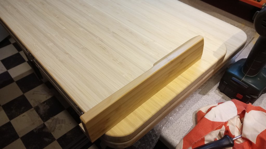 Alukonstruktion. Die seitlichen Blenden mit den kleinen Griffen verhindern dann das Wandern / Verschieben der Platte, indem sie direkt hinter der Kopfleiste