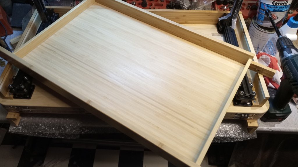 dem Tisch befindlichen Blenden, die Bestandteil des Ablagefachs sind, werden mit Senkschrauben M5 in den Aluprofilen fest verschraubt. Das Bambus ist