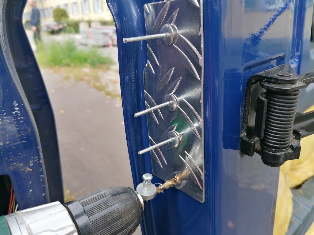 Die Bleche zuschneiden und die Rückseite mit doppelseitiges Klebeband versehen. Löcher ins Alublech vorbohren ( 5,0 mm ) , aufkleben und dann erst die Löcher in die Tür bohren. Am Bohrer habe ich einen Magneten angebracht, der soll die Späne halten. Popnieten rein und pressen. Dann unbedingt noch alles von innen mit Hohlraumkonservierung behandeln. Dabei gleich mal die Tür und an den Pfalzen mit behandeln.