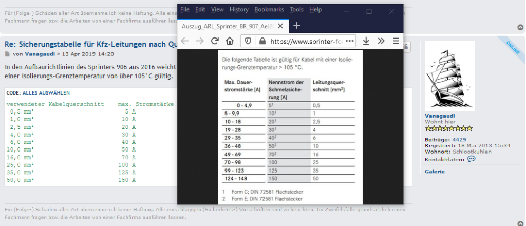 Nicht wirklich, wenn man die Werte vergleicht. Es kommt immer auf die äußeren Umstände an, wie zum Beispiel die angenommene Umgebungstemperatur, der Packungsdichte der Adern, Installationsumgebung. So hat jeder Fahrzeughersteller seine eigenen Grenzwerte definiert, und die können sich über die Jahre hinweg auch noch ändern.Karlie hat geschrieben: 17 Mär 2021 14:07Allerdings gibt es eine Tabelle in der Aufbaurichtlinie für den Sprinter, die grundsätzlich von der o.g. Stromwiderstandstabelle abweicht.