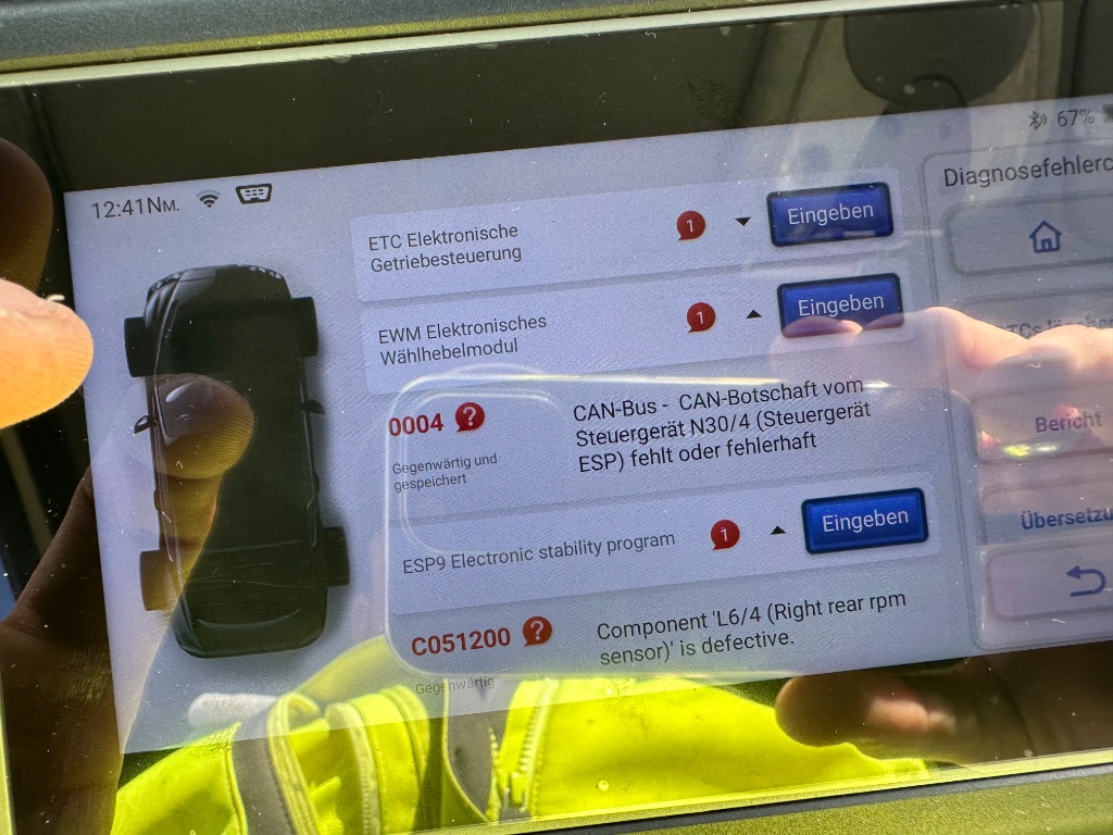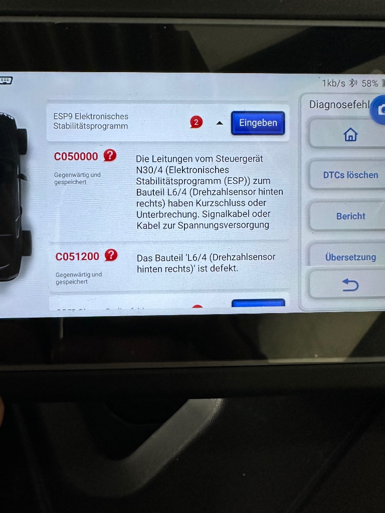 Guten Tag, wahrscheinlich liegt das Problem im Hinterachswelle rechts , da bekommt den Sensor das Signal vom Welle.
