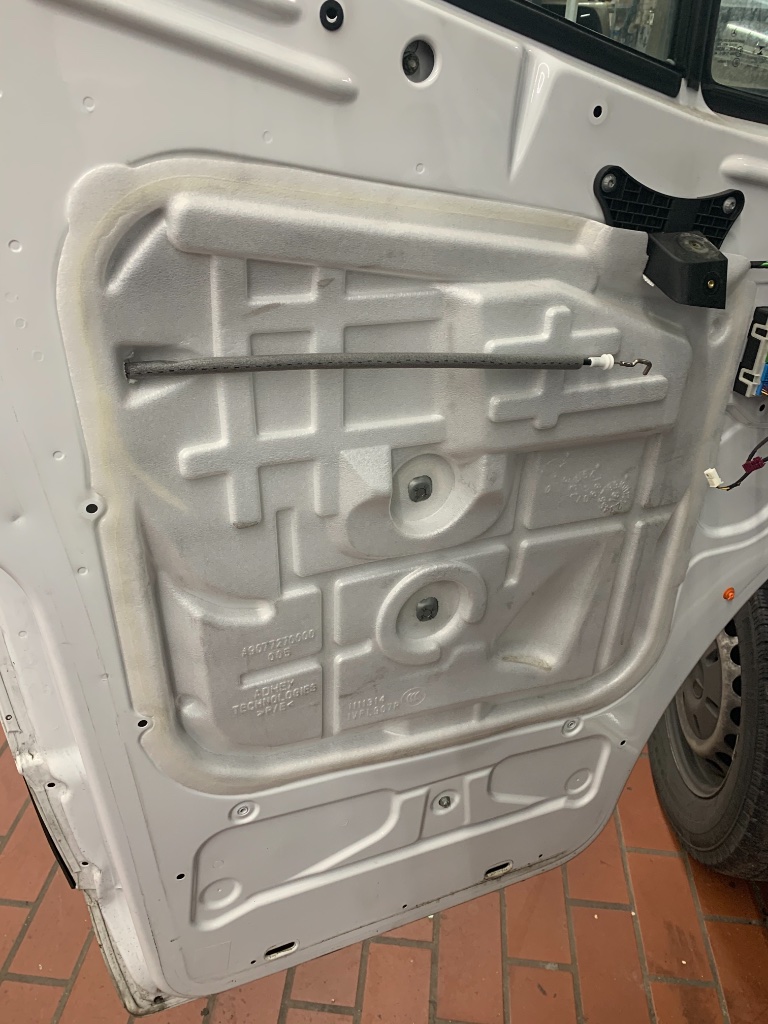 Man muss also jetzt das Wasser in der Tür so umleiten, dass es tatsächlich nur in den Metallschacht läuft und gar nicht erst auf die Idee kommt an der Plastikverkleidung abzulaufen.