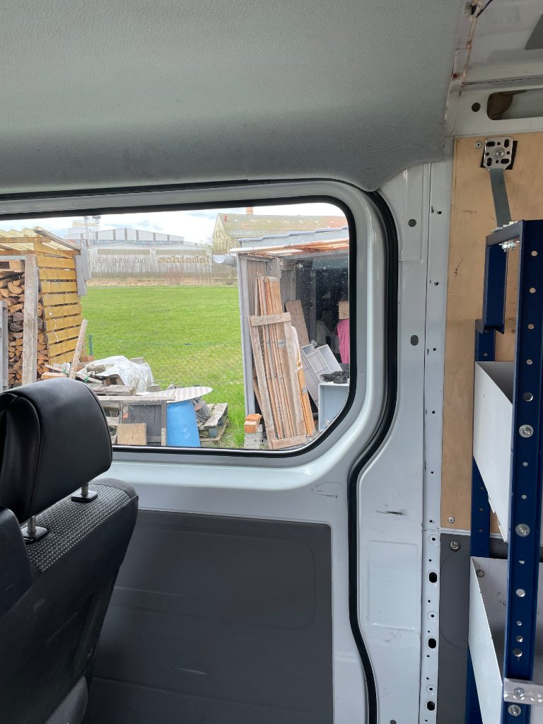 Da wir vorn keine Drehsitze haben und auch dank Doppelsitzbank nicht zwischen den Sitzen nach hinten gehen können, werden wir die Trennwand so behalten und dort unseren Küchenblock befestigen.