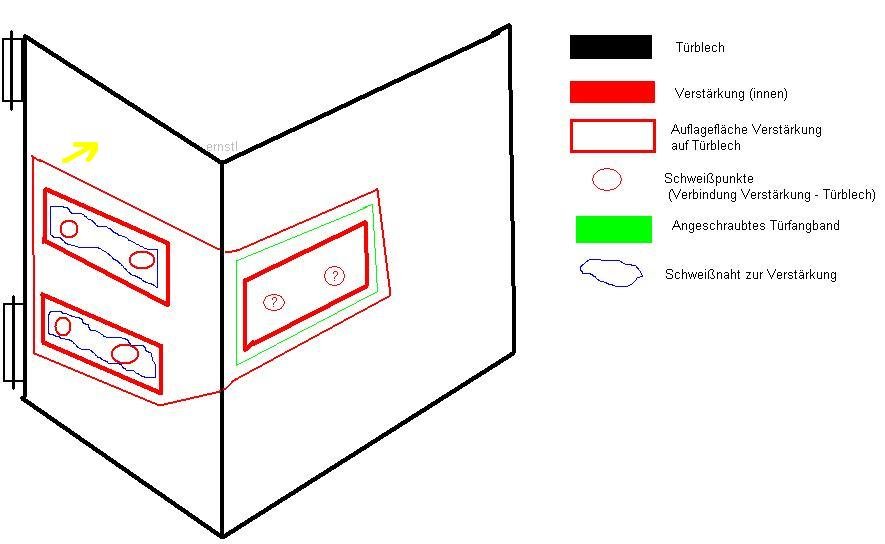 Ich habe hier mal schnell ein Bild gemalt, dass die Sache (hoffentlich) verdeutlicht. Blickrichtung von der "Ladefläche" nach hinten auf die geöffnete Tür. Die Verstärkung liegt an dieser Stelle innen nicht vollflächig auf dem Türblech auf, sondern nur auf 2 quadratischen Flächen (rot), mit jeweils 2 Schweißpunkten verbunden. Am anderen Ende der Verstärkung ist das Türfangband verschraubt. Das dürfte auch dafür sorgen, dass diese Seite unproblematischer / stabiler ist. In diesem Bereich weiß ich es jetzt auf die Schnelle auch nicht mehr genau, wie die Schweißpunkte dort angeordnet waren, daher habe ich Fragezeichen eingefügt.