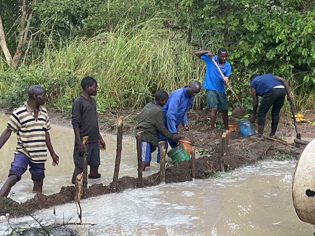 es gab ein dorf im busch,nationalpark,das man von der strasse nicht sehen konnte.ein fahrradfahrer,der vorbei kam, holte hilfe.dann kamen ca. 20 leute mit hacken,schaufeln und eimern.die tauchten unter im wasser ,bis zum kopf um zu prüfen wie das fahrzeug aufsass.
