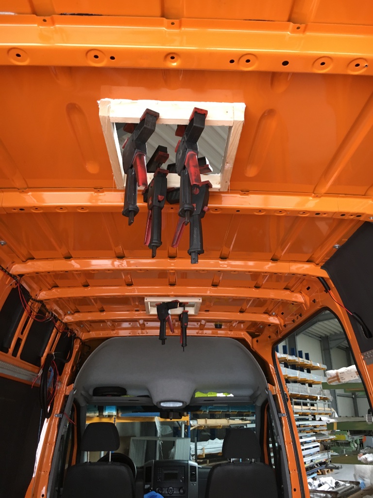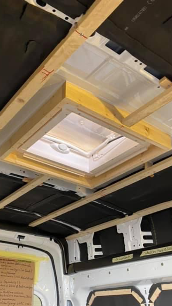 Endlich zu Hause angekommen wurden dann erstmal alle Verkleidungen, Trennwand und Boden entfernt und alle gefundenen Roststellen, hauptsächlich an den hinteren Radläufen, entsprechend behandelt. Anschließend gab es ne Ladung Armaflex rundum sowie 2 Dachfenster in 28x28cm. Eigentlich zu klein, aber ich hab damals keinen Anbieter gefunden, der entsprechende Unterbauten für die Dachsicken herstellt. Die vielfach gezeigtenEigenkonstruktionen mit Latten oder einfach nur mit Sikaflex aufgefüllt, waren mir zu unsicher…